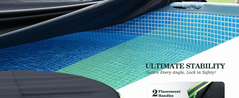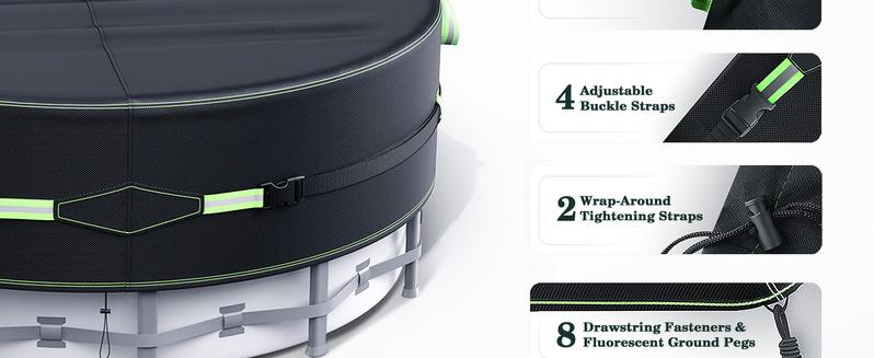 - 【Exclusive Patent】The middle part of the pool cover is surrounded by 2 webbings, and the bottom is equipped with a full circle of drawstrings. Most sellers use steel wire ropes for tightening, but our full circle of webbing is more convenient and will not tear due to strong pulling. The buckle and drawstring are tightened at the same position, which is more convenient to operate.