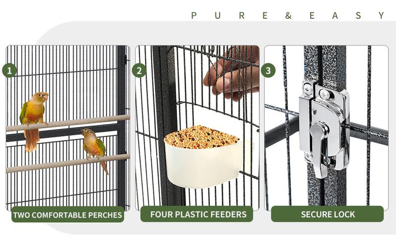 Convenient Cleaning: The large Parrot cage is equipped with Wrought iron wire and a slide-out tray, which makes it more simple to clean bird droppings and their food.